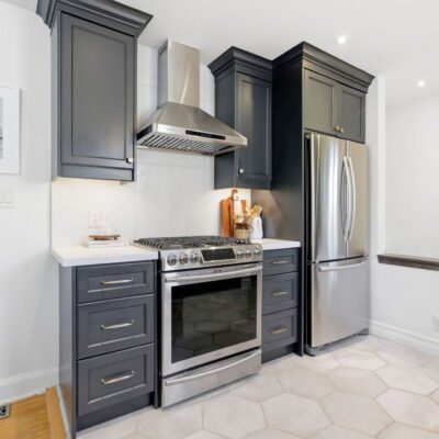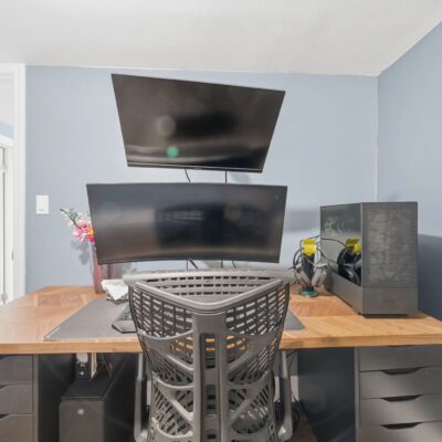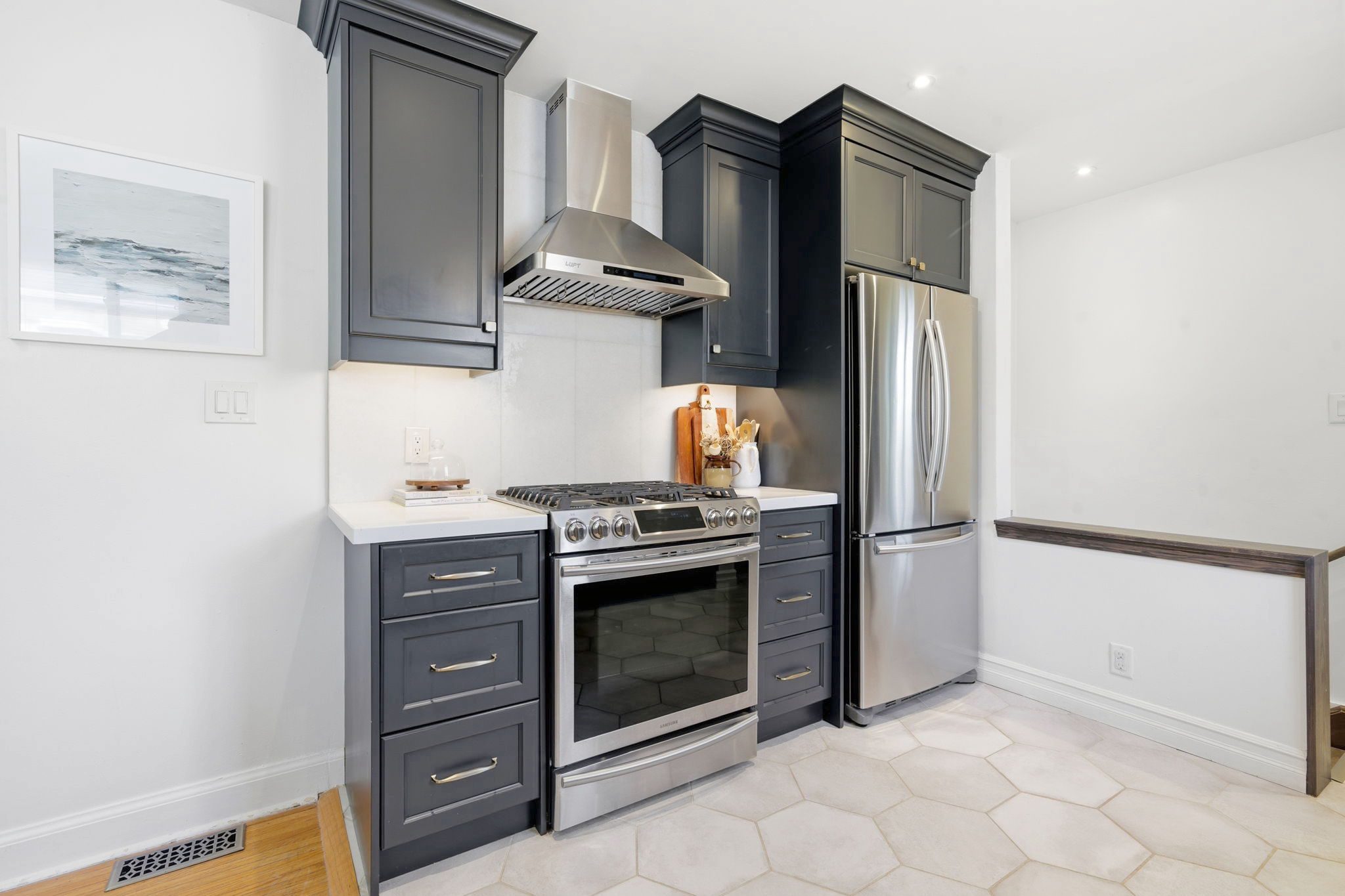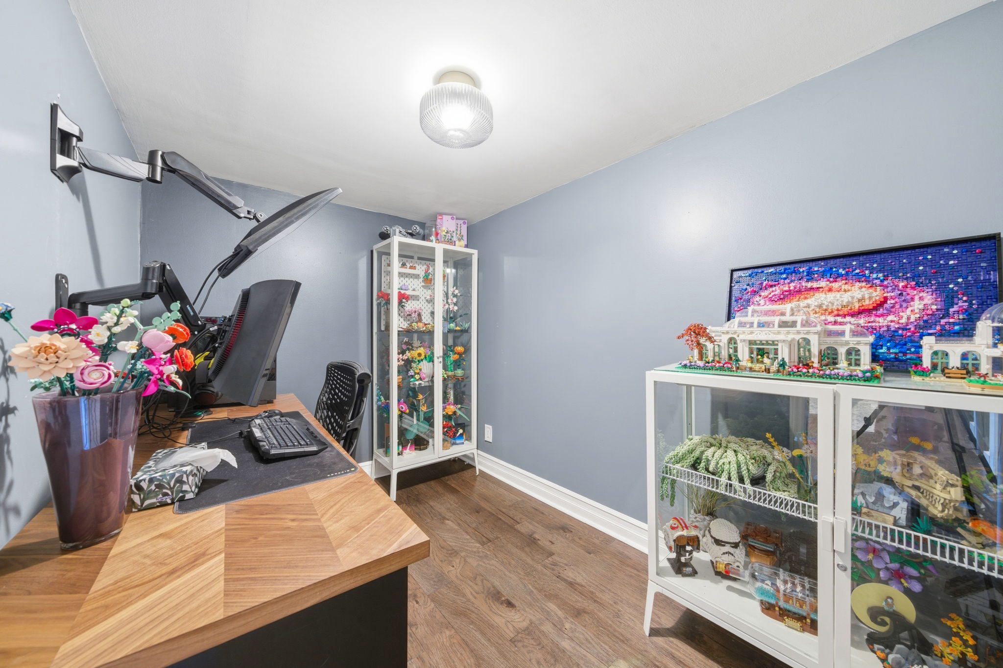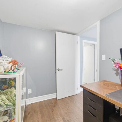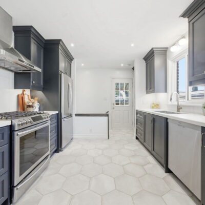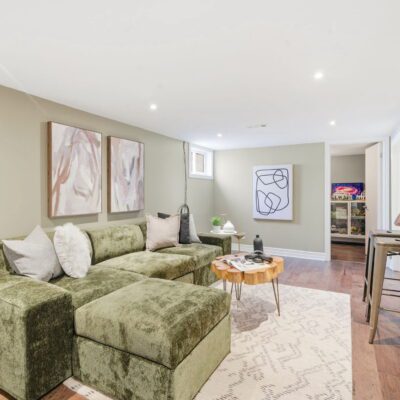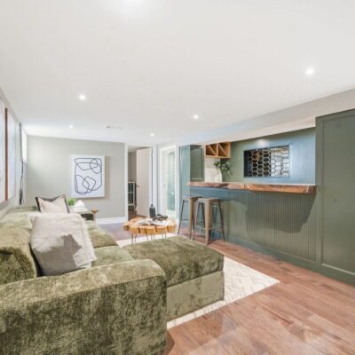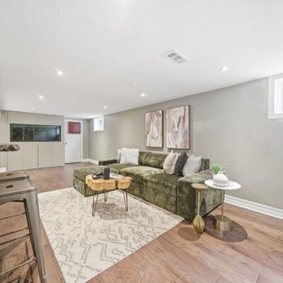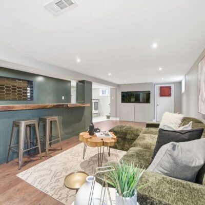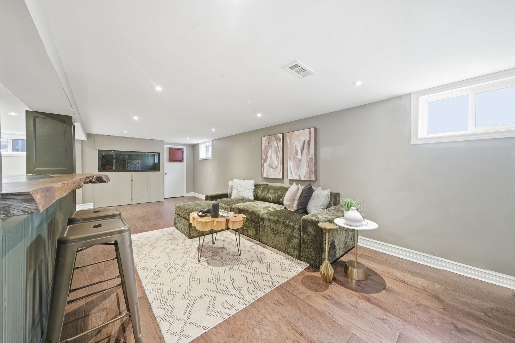Inside, the open-concept layout is flooded with natural light through German tilt-and-turn windows, creating a warm and inviting atmosphere. The kitchen has been completely upgraded, showcasing a sleek design with modern cabinetry, a gas stove, and high-end appliances—perfect for culinary enthusiasts. The renovated basement offers a stylish bar area ideal for entertaining, along with a versatile home office that provides flexible space for a growing family.